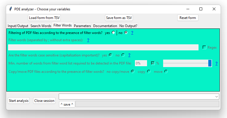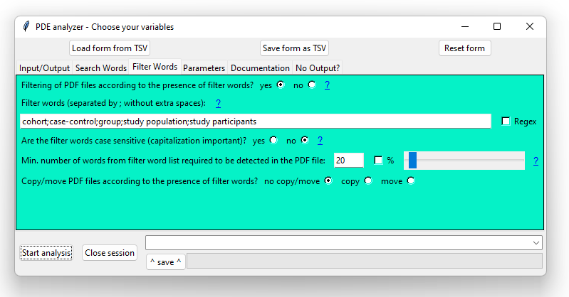 5. Filter word times: This represents the minimum number of hits described above which has to be detected for a paper to be further analyzed. If the threshold is not met, a documentation file can be exported if selected in the documentation section. The filter word threshold can either be an abolute number or a percentage.