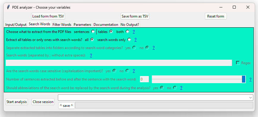 1. Choose what to extract: The PDE analyzer has 2 main functions A] PDF2TXT (extract sentences from pdf) and B] PDF2TABLE (table of PDF to excel file) which can be combined or executed separately. Each function can be combined with filters and search words. A file with the sentences carrying the search words will have the name format: [search words]txt+-[context][PDF file name] in the corresponding subfolder. Tables will be named: [PDF file name][number of table][table heading].