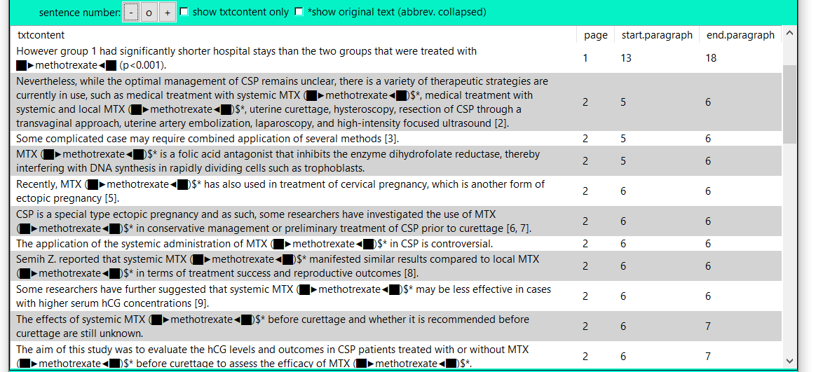 1. Show original text (abbreviations collapsed): Choosing this setting will restore the orginial sentences by replacing ABBREVIATION (search word)$* with ABBREVIATION, e.g., MTX (Methotrexate)$* with MTX.