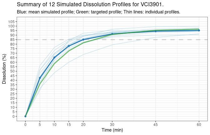 1. sim.summary: A data frame with summary statistics of all individual dissolution profiles.