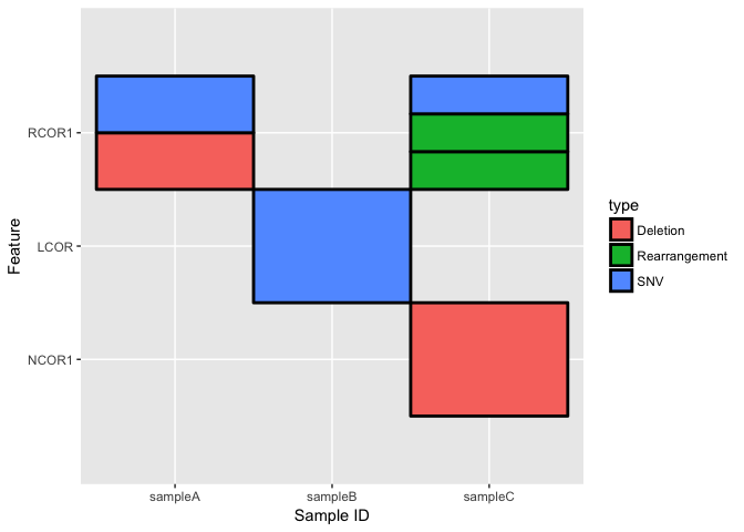 cofeatureR is an R Package that provides functions for plotting cofeature matrices (aka. feature-sample matrices). For example: