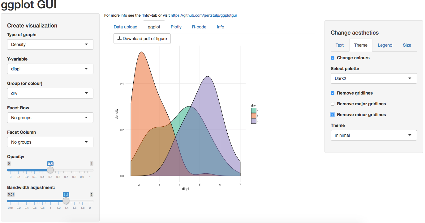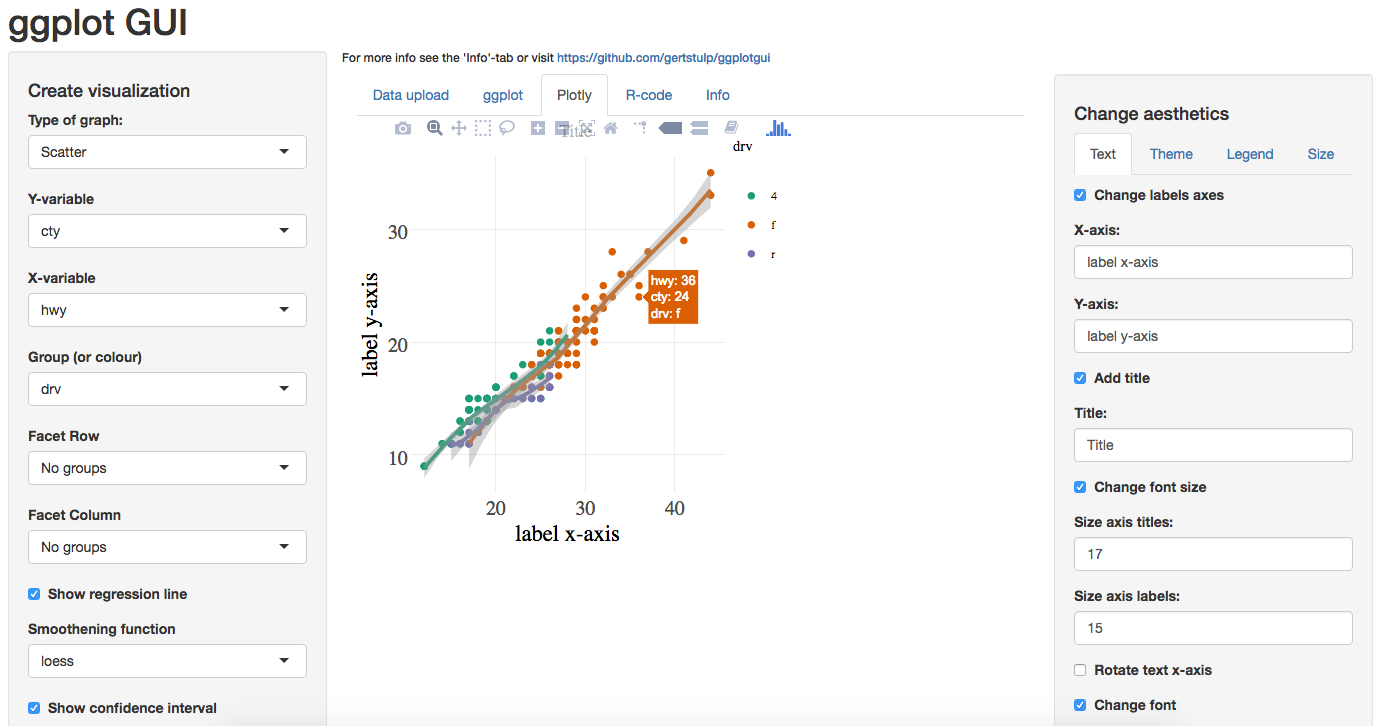 A ggplot-graph can be made through point and click (after data is loaded and through the ggplot-tab): Aesthetics of the graph can be changed with the tabs on the right hand side.