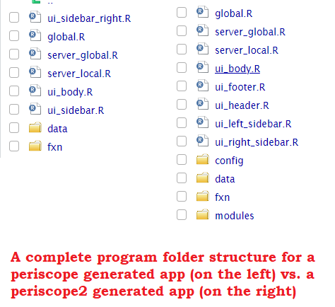 periscope2 is a scalable and UI-standardized ‘shiny’ framework including a variety of developer convenience functions with the goal of both streamlining robust application development and assisting in creating a consistent user experience regardless of application or developer.
