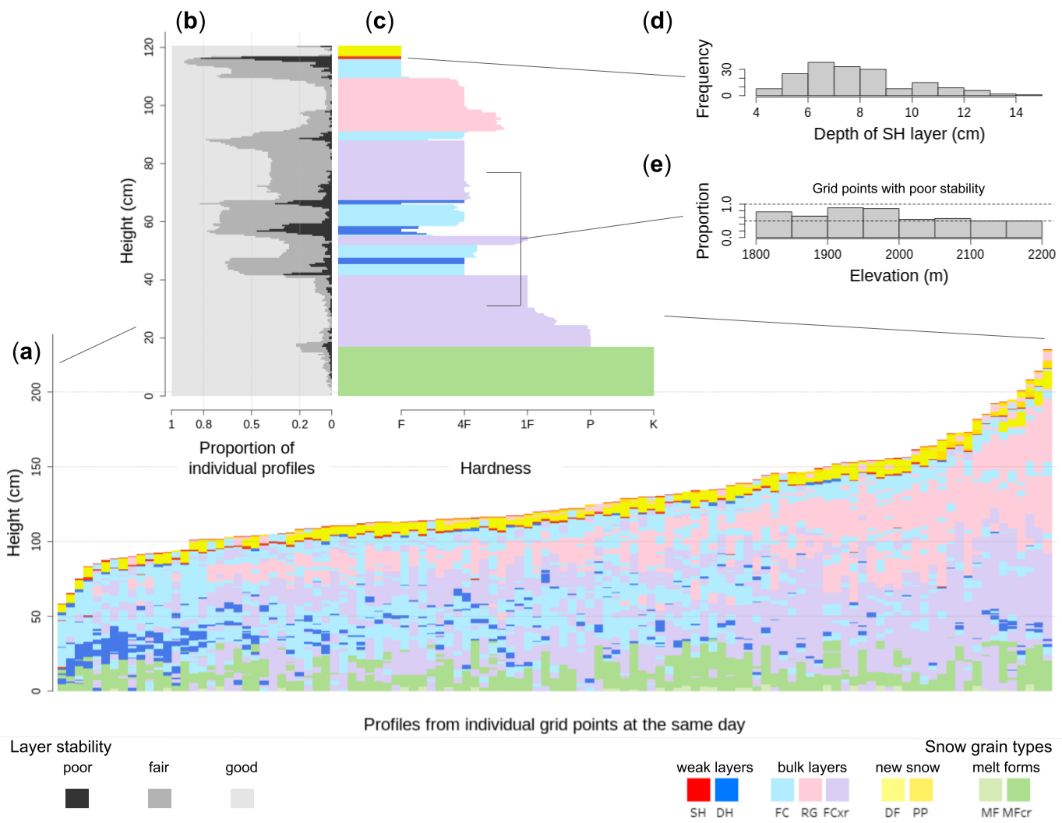 The figure shows (a) a snow profile set from an avalanche forecast region with 112 simulated profiles from the same day, (c) which is summarized by the average profile. The average profile provides access to distributions of layer and profile properties, such as e.g. (b) the distribution of layer stabilities derived from threshold sums, (d) the depth distribution of a SH layer that is starting to get buried, (e) the elevation distribution of the proportion of profiles that contain layers with poor stability in mid snowpack.