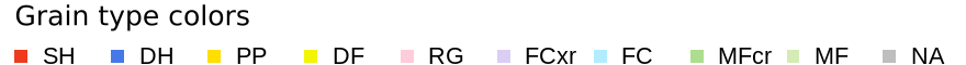 Time series of the average snow profile that illustrates the space-averaged evolution of the snow stratigraphy (visualized by snow grain types). The algorithm captures the median total snow height (solid line, ), the median amount of new snow (dashed line, ), and the median depth of several persistent weak layers (dotted lines, ).