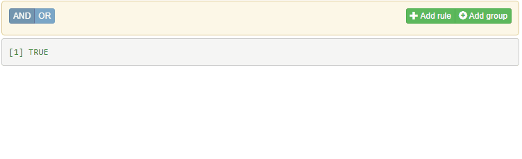 In order to render the widget, pass the defined filters to queryBuilderInput() and place the output to the Shiny’s UI object: