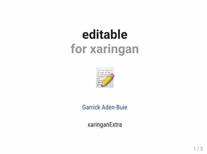 Editable gives you a way to write directly inside your slides, updating your content live. Make any element of your slides editable by using the .can-edit[...] class.