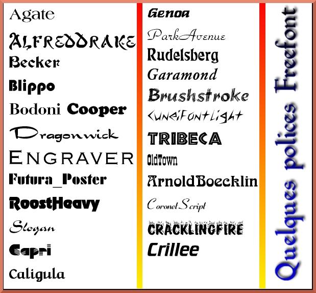 تنبيه: إنه أداة بلا رحمة. خطأ واحد عندما تكتب اسم الخطّ قد تجبرك أن تعيد من البداية. لذا يستحسن أن تستعمل مدير خطوط KDE في الوقت نفسه مع Gimp. حينها ترى اسم الخط جيدا و تعاينه أيضا. الشكل 3 يعرض بعض الخطوط التي تفيد في رسم شعارات رائعة أو رسائل مميزة.