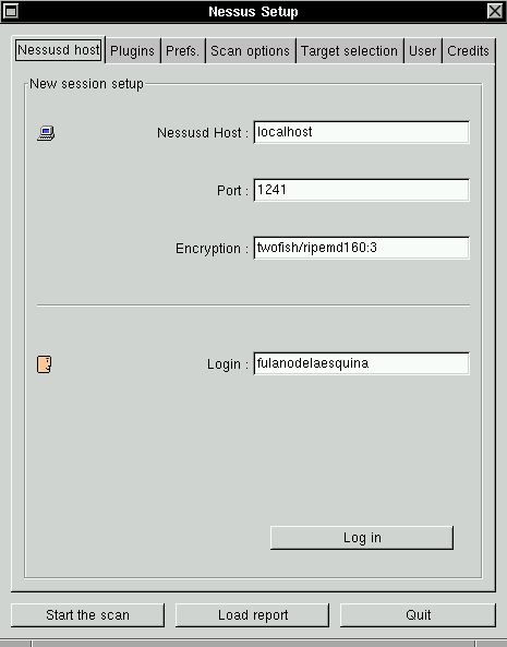 The first tab is called "nessusd host". From it you can connect to the nessusd host clicking on the "Log in" button. Of course, this assumes you're allowed to connect as this user, in other words, that your username exists in the user database.