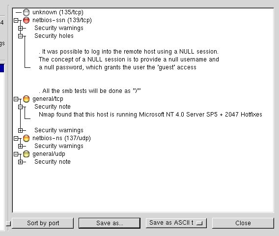 These reports can be saved as text, NSR, HTML, HTML with pies... thus allowing comparisons between two scans. It may seem obvious, but the state of a network at a given time may be quite different from what it can be 30 minutes later. Why ? A network is alive ! This is one of the main reasons why securing a network is not easy : things change all the time. If you're wondering about the need to use tools such as nessus and nmap, that is the answer.