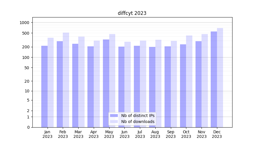 Number of downloads for software package diffcyt, year by year, from 2025 back to 2014 (years with no downloads are omitted):
