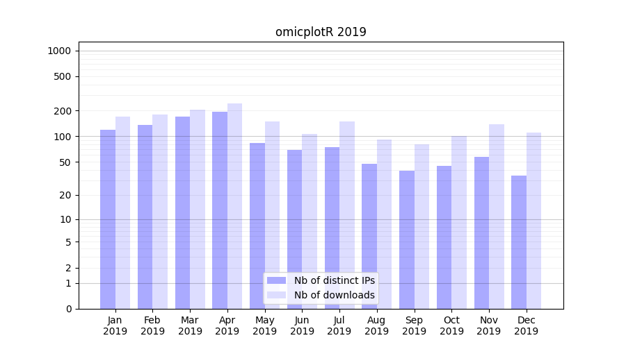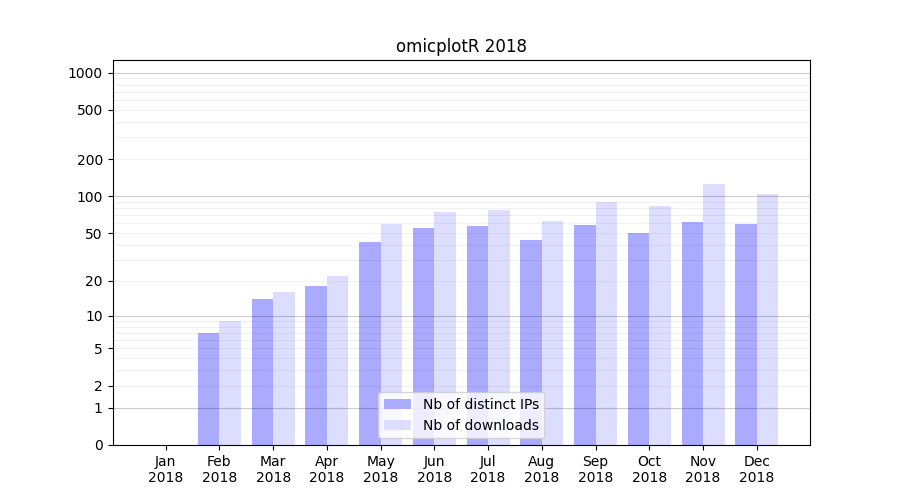 Number of downloads for software package omicplotR, year by year, from 2025 back to 2014 (years with no downloads are omitted):