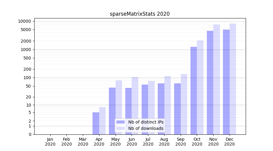Number of downloads for software package sparseMatrixStats, year by year, from 2025 back to 2014 (years with no downloads are omitted):