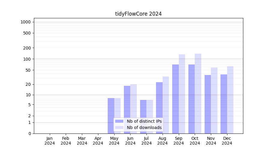 Number of downloads for software package tidyFlowCore, year by year, from 2025 back to 2014 (years with no downloads are omitted):