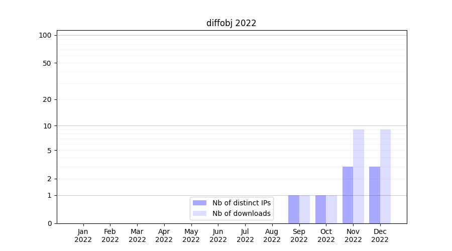 Number of downloads for workflow package diffobj, year by year, from 2025 back to 2015 (years with no downloads are omitted):