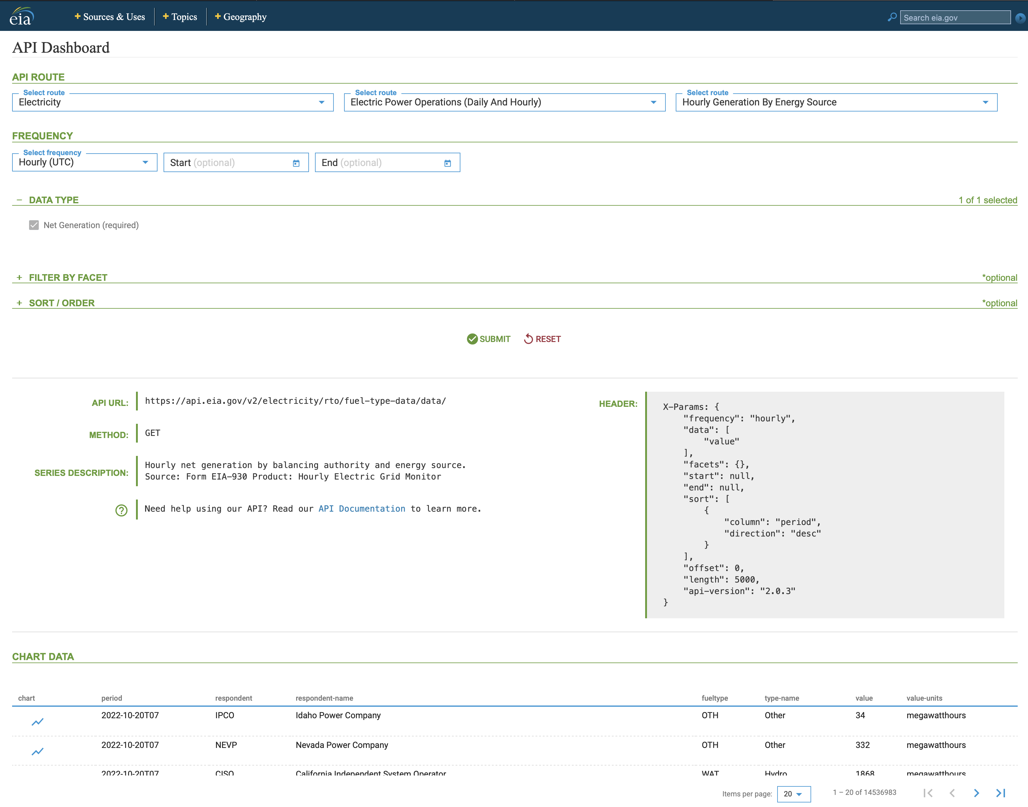 You can narrow down your pull by using the facets argument and applying some filters. For example, in the example above, let’s filter data by the fuletype field and select energy source as Natural gas (NG) and the region as United States Lower 48 (US48), and then extract the header: