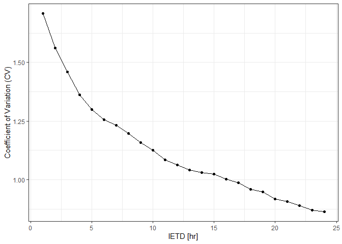 The CVA function on the other hand computes the inter-event time definition (IETD) based on the coefficient of variation analysis. This method assumes b is represented well by an exponential distribution. Since b>= IETD, IETD is computed as the value whose resulting coefficient of variation (CV) of b equal to unity.This analysis is done by testing several values of IETD and analyzing the resulting CV. The computed IETD is obtained via interpolation from the figure of IETD vs CV. The required inputs are a sub-daily rainfall time series and the maximum value of IETD to be analyzed (in hours). The sub-daily rainfall time series must be in a dataframe; first column contains the time and day of the rainfall pulse and the second one the depth of rainfall in each time step. The date must be as POSIXct class. The CVA function returns a list with a figure of IETD vs CV, a dataframe with the values of that figure, and the computed value of IETD.