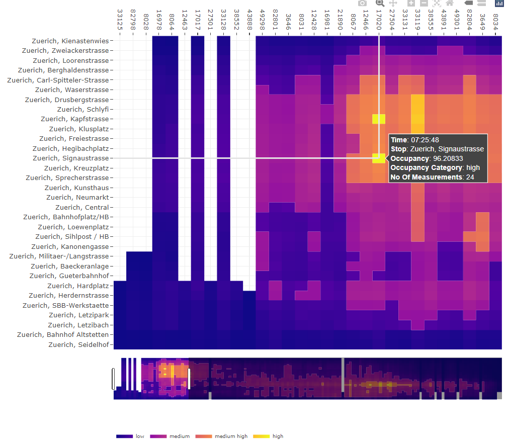 This package is originally being developed for Verkehrsbetriebe Zürich (VBZ), the public transport operator in the Swiss city of Zurich, to illustrate the utilization of different routes and vehicles during different times of the day. Therefore, it groups utilization data (e.g. persons per m^2) into different categories (e.g. low, medium, high utilization) and illustrates it for certain stops over time in a heatmap.