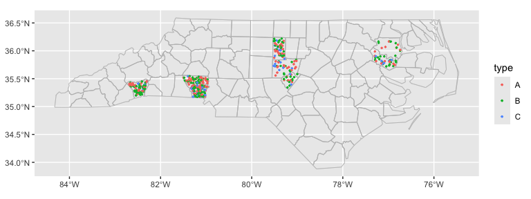 geom_geoscatter(aes(colour = type), size = 0.5) +