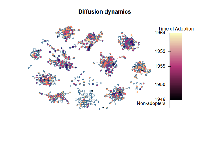 The package was developed as part of the paper Thomas W. Valente, Stephanie R. Dyal, Kar-Hai Chu, Heather Wipfli, Kayo Fujimoto, Diffusion of innovations theory applied to global tobacco control treaty ratification, Social Science & Medicine, Volume 145, November 2015, Pages 89-97, ISSN 0277-9536 (available here).