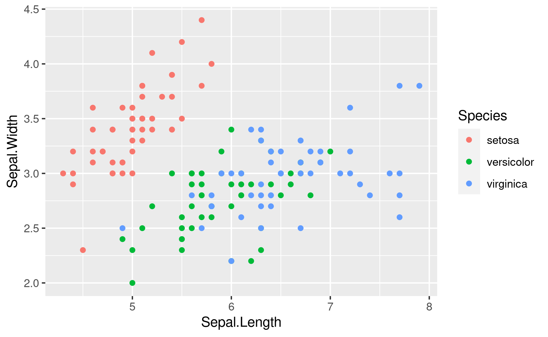 x = Sepal.Length, y = Sepal.Width, color = Species