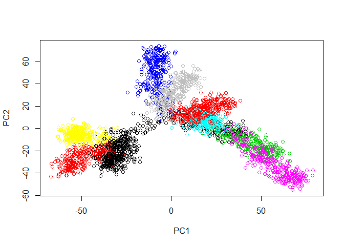 plot(prcomp(tree.data$data)$x, col=tree.data$branches)