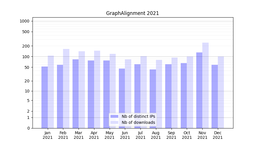 Number of downloads for software package GraphAlignment, year by year, from 2025 back to 2014 (years with no downloads are omitted):