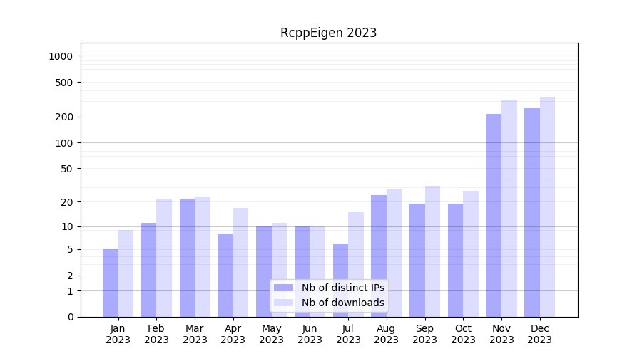 Number of downloads for software package RcppEigen, year by year, from 2025 back to 2014 (years with no downloads are omitted):