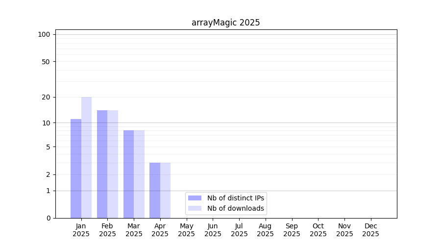 Number of downloads for software package arrayMagic, year by year, from 2025 back to 2014 (years with no downloads are omitted):