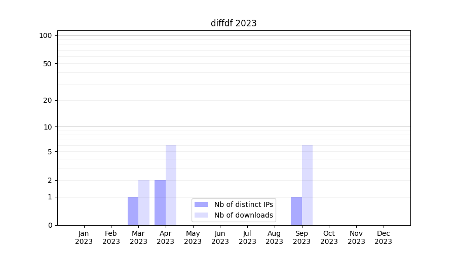 Number of downloads for software package diffdf, year by year, from 2025 back to 2014 (years with no downloads are omitted):