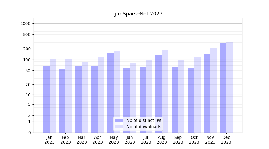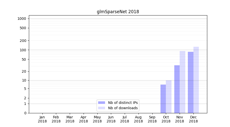 Number of downloads for software package glmSparseNet, year by year, from 2025 back to 2014 (years with no downloads are omitted):