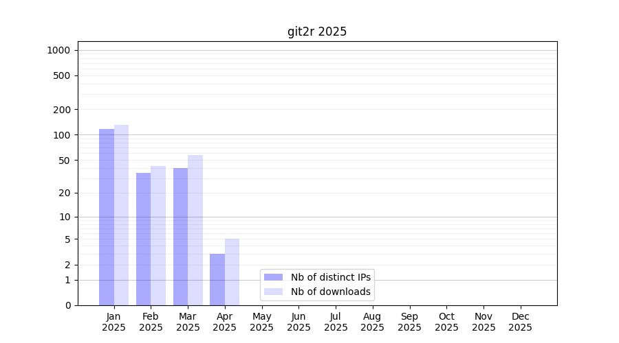 Number of downloads for annotation package git2r, year by year, from 2025 back to 2014 (years with no downloads are omitted):