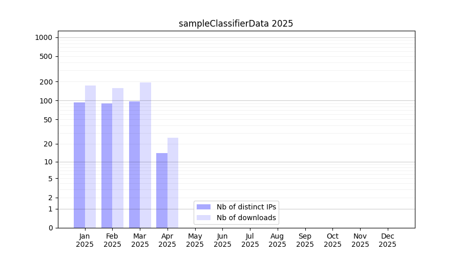Number of downloads for experiment package sampleClassifierData, year by year, from 2025 back to 2014 (years with no downloads are omitted):