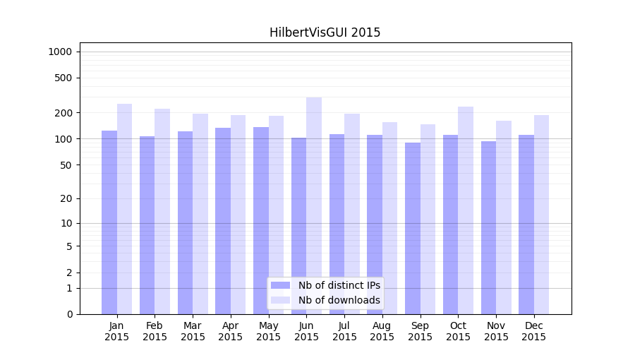Number of downloads for software package HilbertVisGUI, year by year, from 2025 back to 2014 (years with no downloads are omitted):