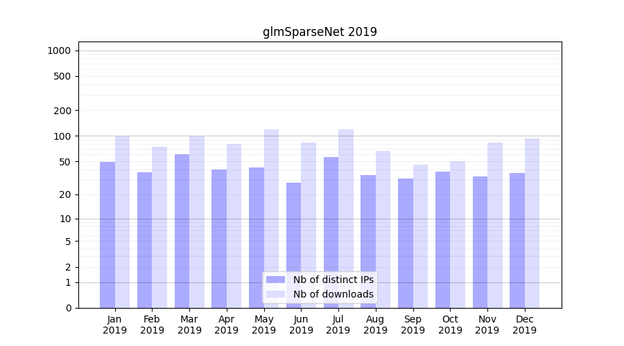 Number of downloads for software package glmSparseNet, year by year, from 2025 back to 2014 (years with no downloads are omitted):