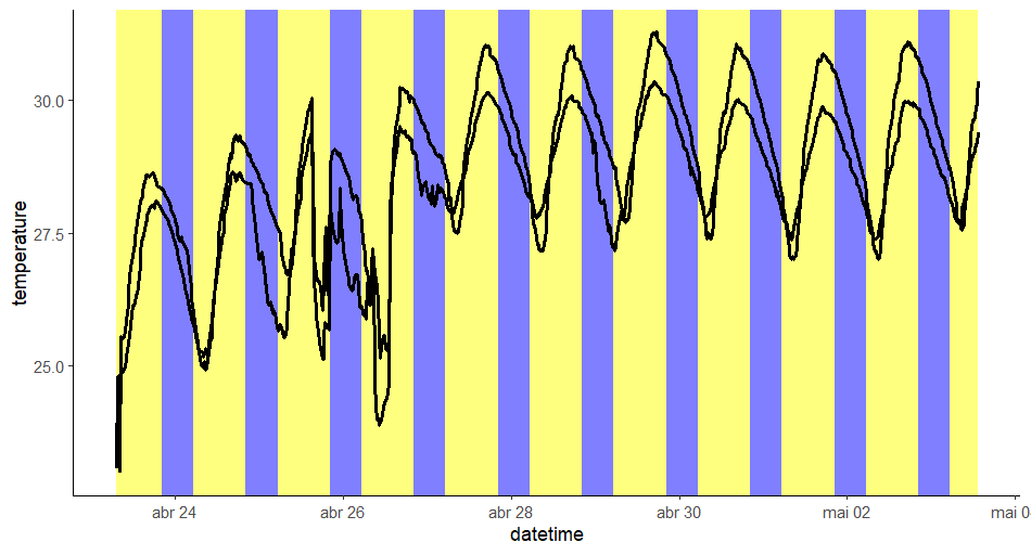 ggplot(daynight_temperature, aes(datetime, temperature, group = sensor)) +