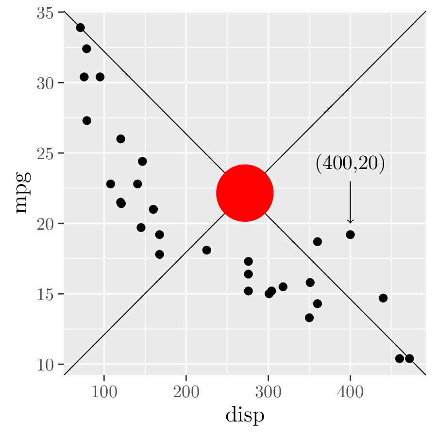 p <- ggplot(mtcars, aes(disp, mpg)) + geom_point() # 1.