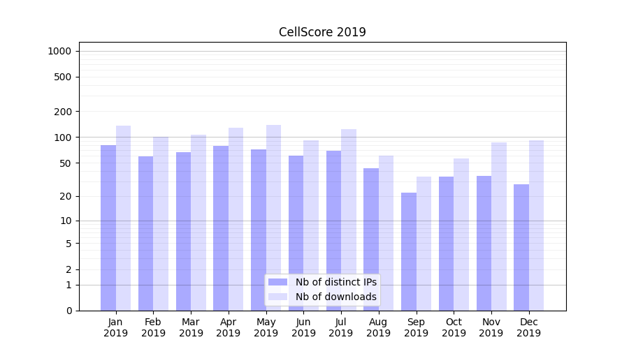 Number of downloads for software package CellScore, year by year, from 2025 back to 2014 (years with no downloads are omitted):