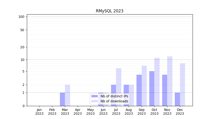 Number of downloads for software package RMySQL, year by year, from 2025 back to 2014 (years with no downloads are omitted):
