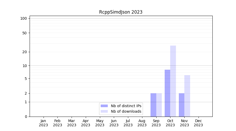 Number of downloads for software package RcppSimdJson, year by year, from 2025 back to 2014 (years with no downloads are omitted):