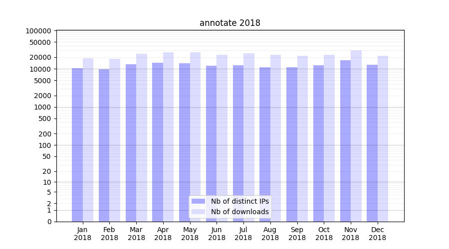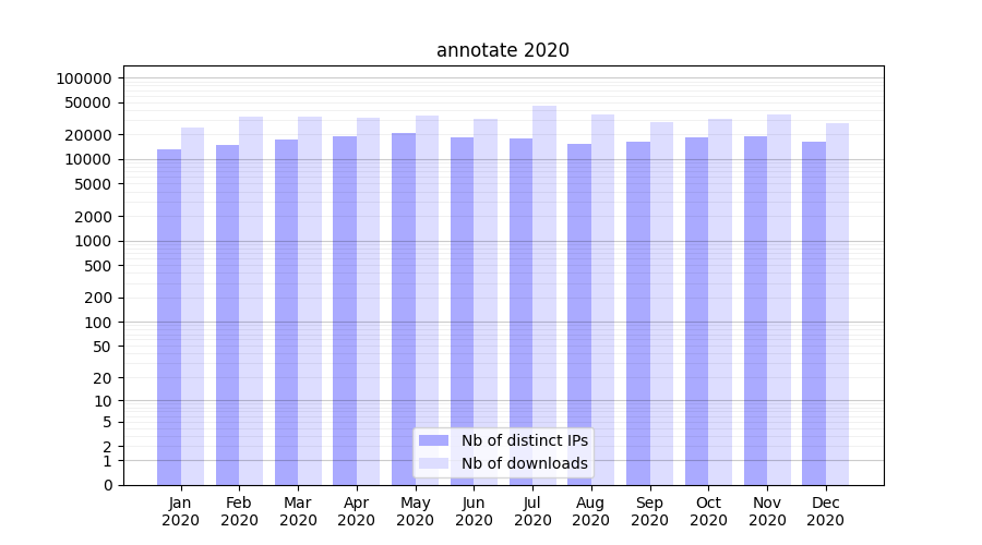 Number of downloads for software package annotate, year by year, from 2025 back to 2014 (years with no downloads are omitted):