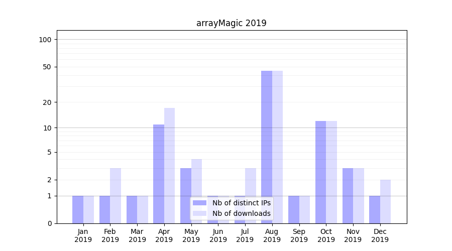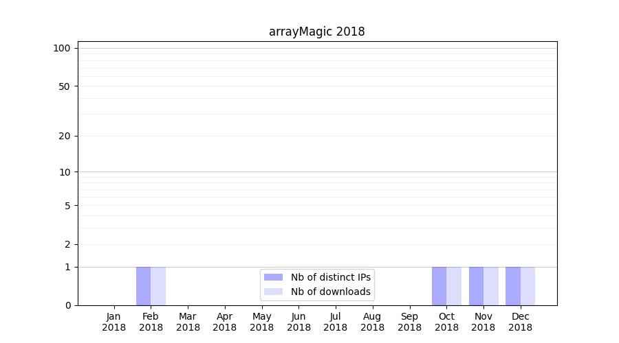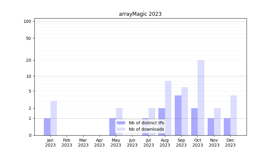 Number of downloads for software package arrayMagic, year by year, from 2025 back to 2014 (years with no downloads are omitted):