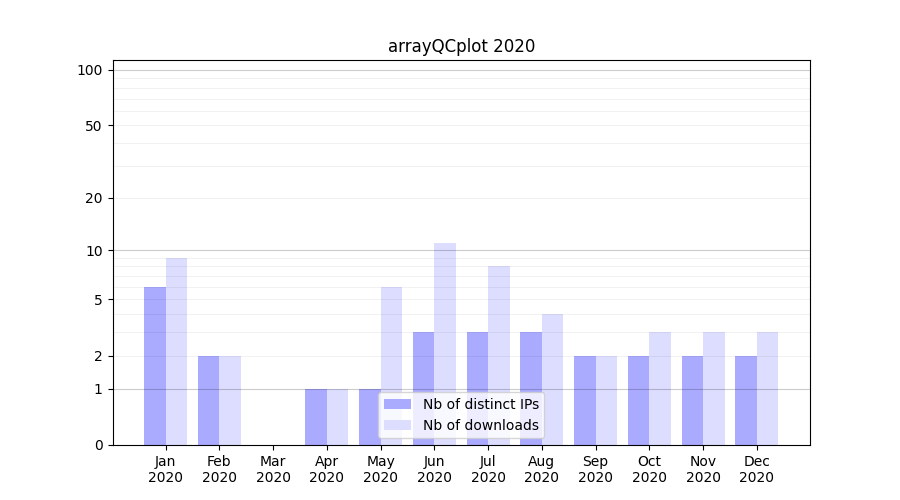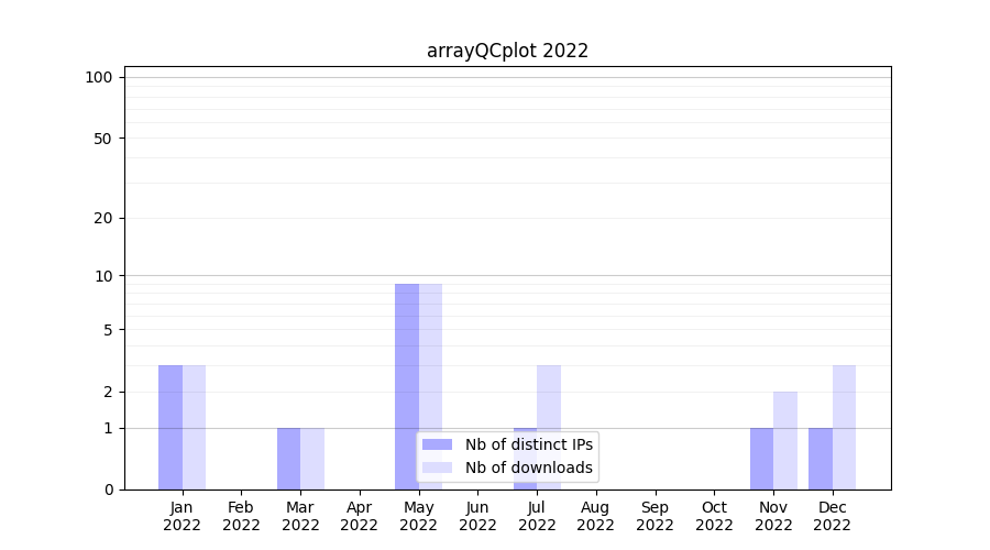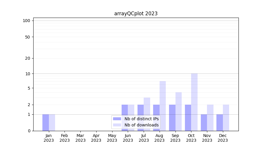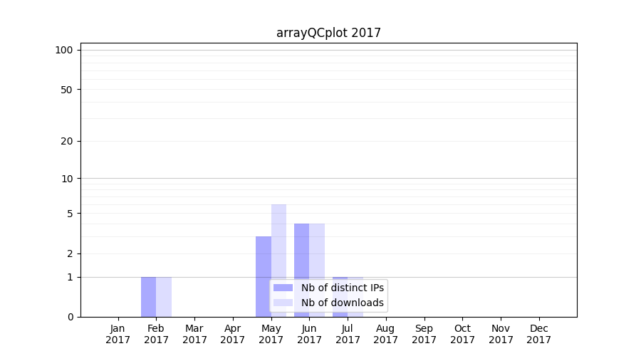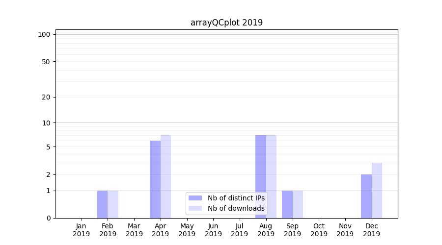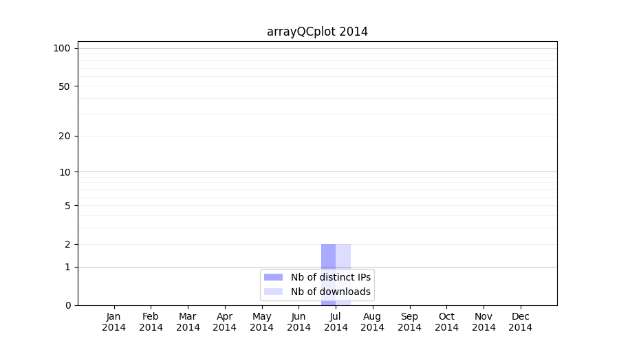Number of downloads for software package arrayQCplot, year by year, from 2025 back to 2014 (years with no downloads are omitted):
