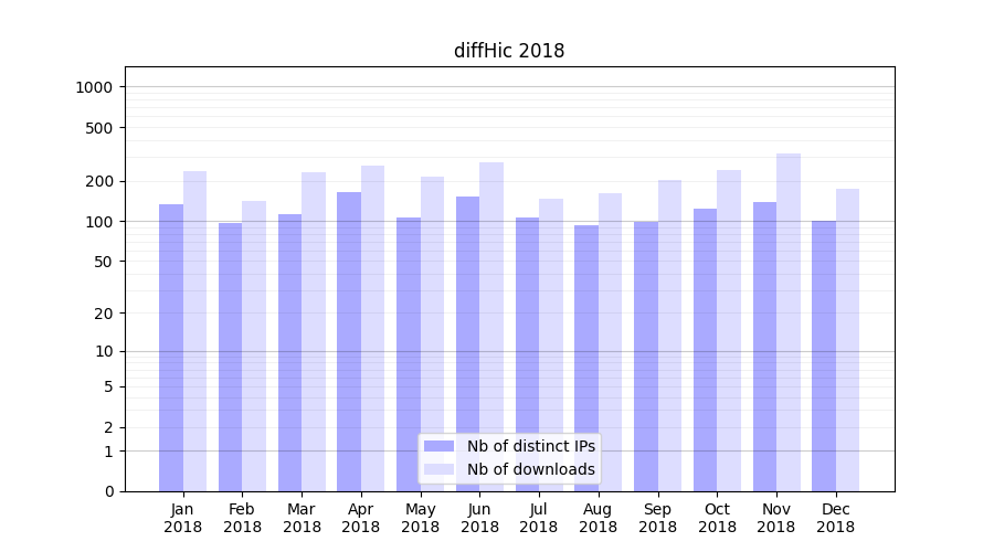 Number of downloads for software package diffHic, year by year, from 2025 back to 2014 (years with no downloads are omitted):