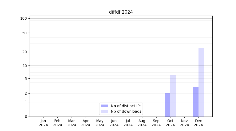 Number of downloads for software package diffdf, year by year, from 2025 back to 2014 (years with no downloads are omitted):