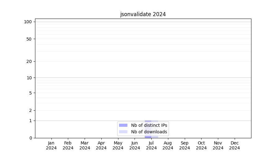 Number of downloads for software package jsonvalidate, year by year, from 2025 back to 2014 (years with no downloads are omitted):