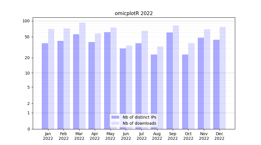 Number of downloads for software package omicplotR, year by year, from 2025 back to 2014 (years with no downloads are omitted):