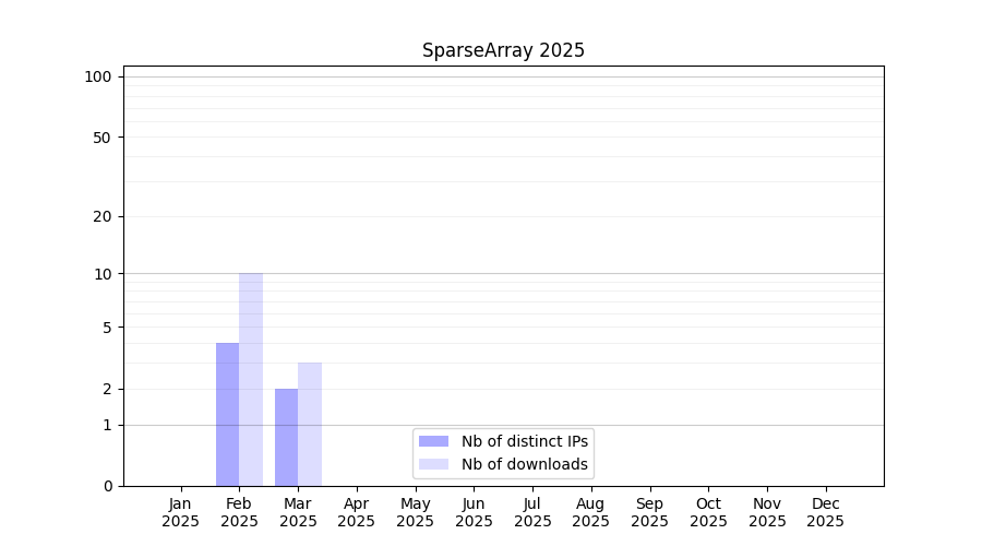 Number of downloads for annotation package SparseArray, year by year, from 2025 back to 2014 (years with no downloads are omitted):