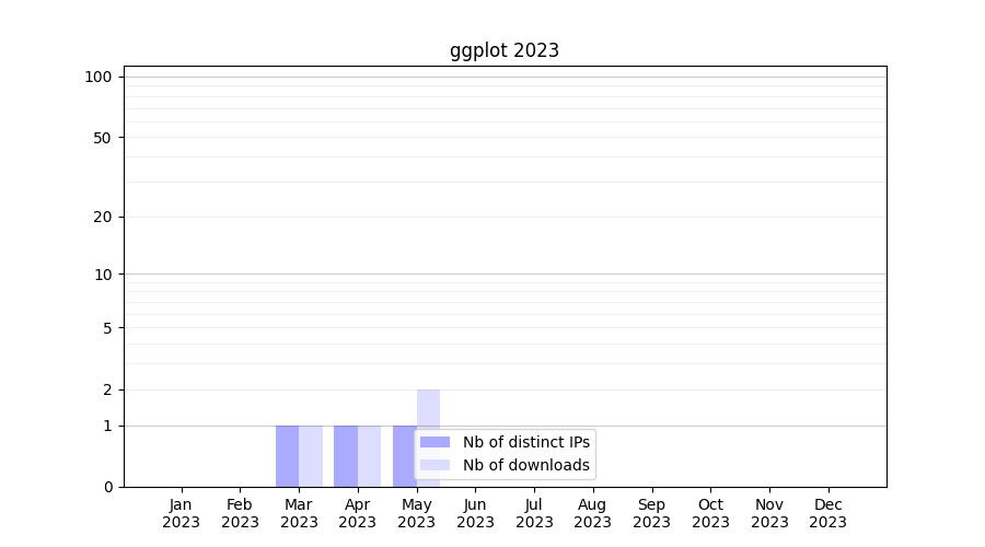 Number of downloads for annotation package ggplot, year by year, from 2025 back to 2014 (years with no downloads are omitted):