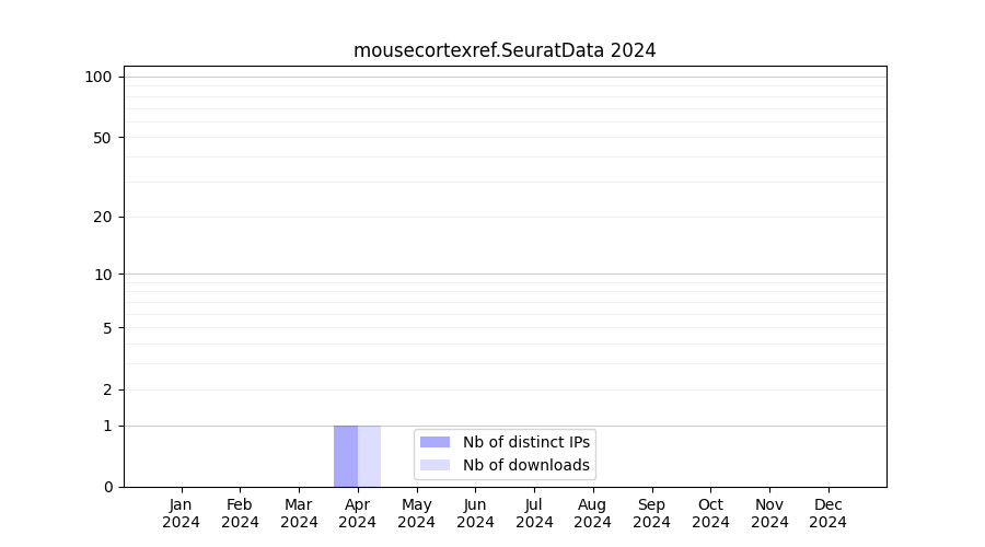 Number of downloads for annotation package mousecortexref.SeuratData, year by year, from 2025 back to 2014 (years with no downloads are omitted):